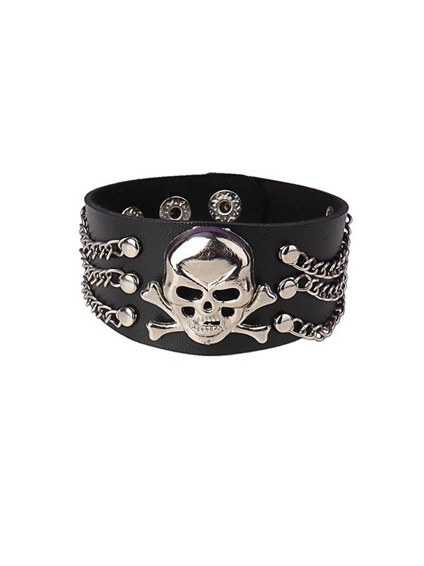 Chain Embellish Skull Chunky Pu Leather Bracelet