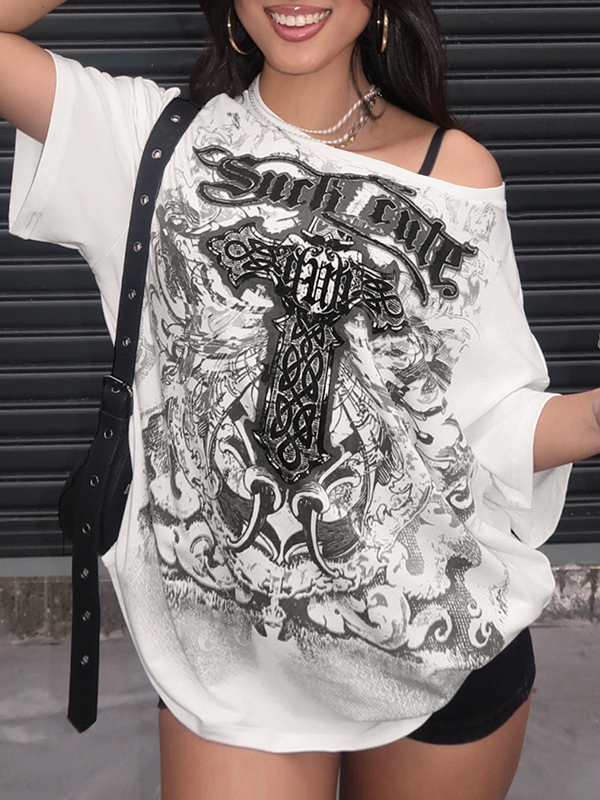 Cat Off Shoulder Oversized Long Sleeves Tee