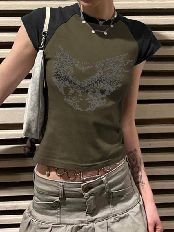 Y2K Wings Print Contrast Raglan Slim Short Sleeve Tee