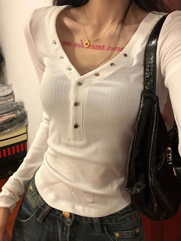 Solid V Neck Snap Button Slim Long Sleeve Knit