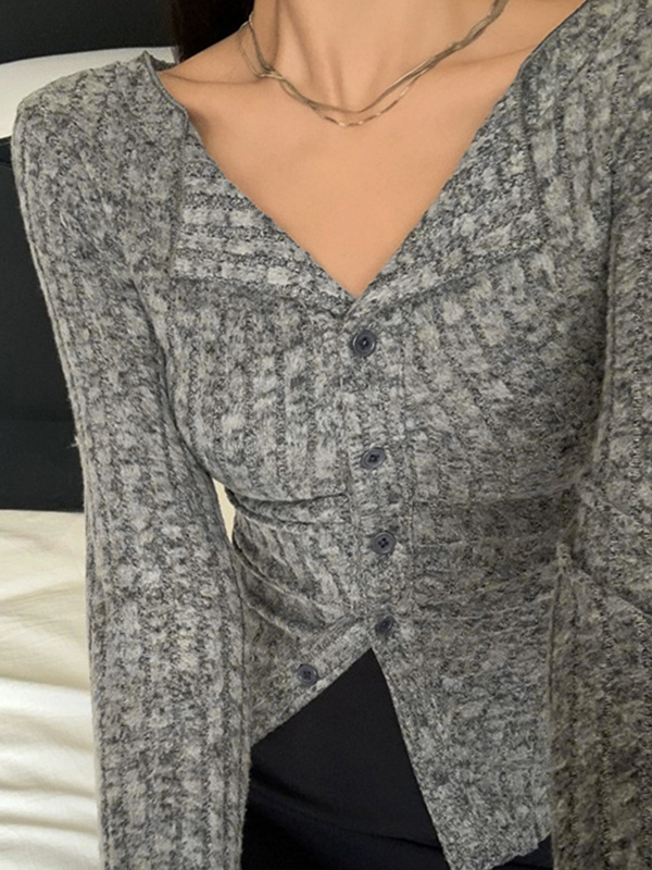 Lapel Neck Ruched Slim Long Sleeve Knit