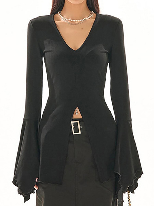 Solid V Neck Slit Trumpet Sleeve Long Sleeve Blouse