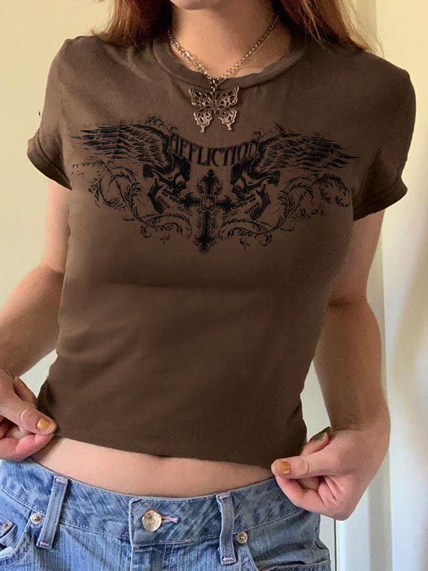 Dark Style Print Crew Neck Cropped Short Sleeve Tee