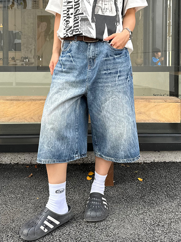 Vintage Washed Lightning Bolt Pattern Denim Shorts
