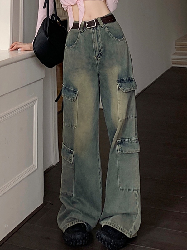 High Waist Multi Pocket Mopping Cargo Jeans
