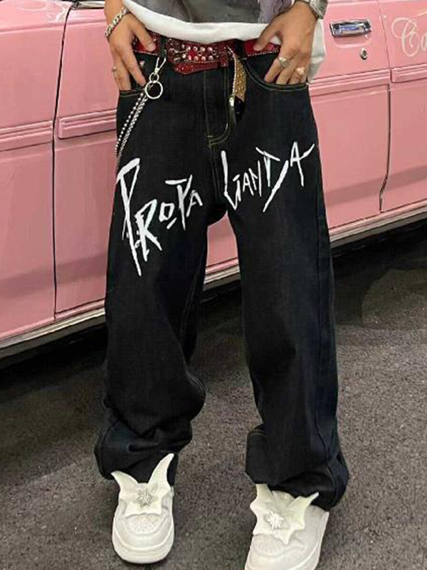 Butterfly Print Blue Wash Baggy Boyfriend Jeans