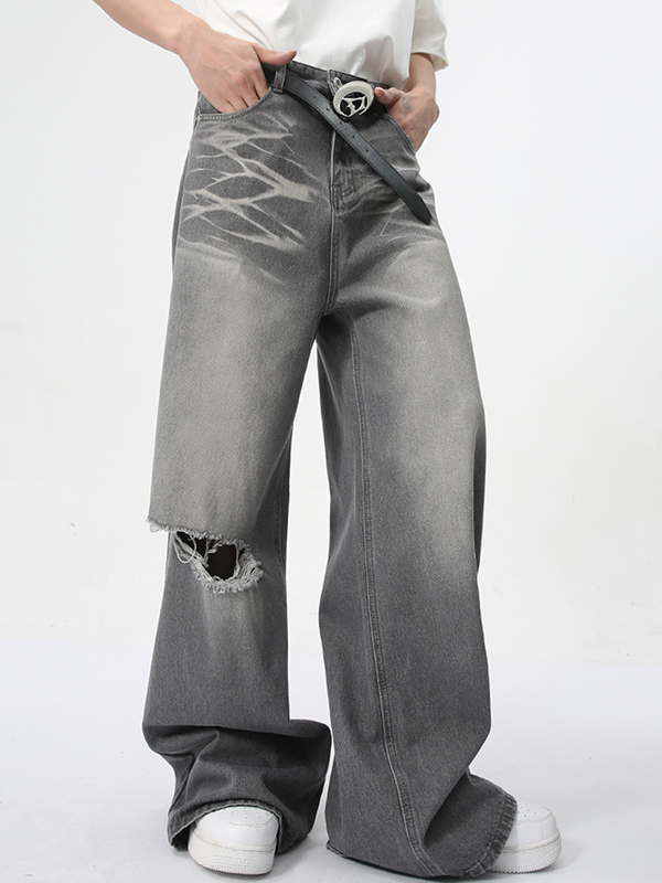Vintage Washed Pattern Holes Loose Jeans