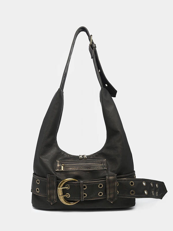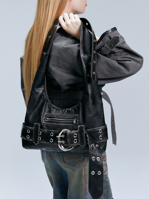 Distressed Washed Leather Belt Buckle Large Adjustable Shoulder Strap Bag