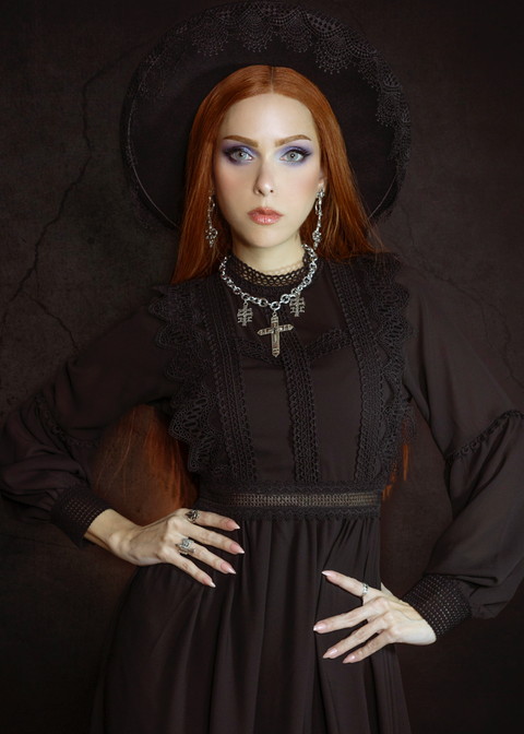Denne boheme-heksekjole er perfekt til den afdøde sjæl. Let og midi-længde, med nitter i taljen, lynlås bagpå og ballonærmer.