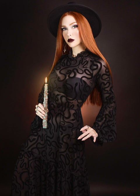 Sloane – Fløjlsmønstret maxikjole med slangemønstret mønster og klokkeærmer