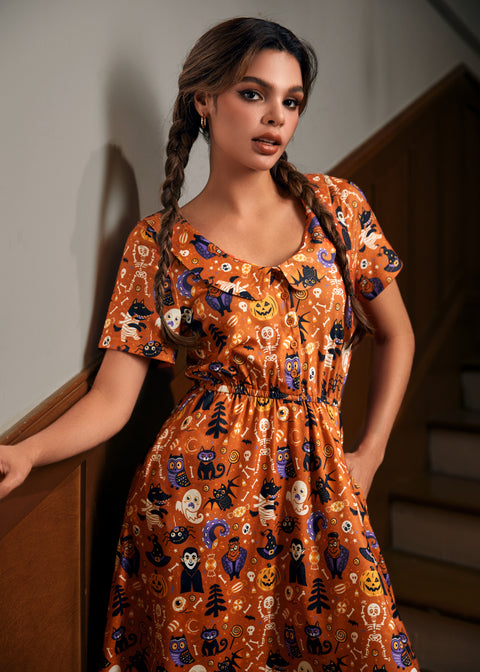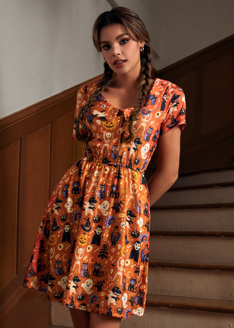 Træd ind i uhyggelig chic stil med Ghouls Just Wanna Have Fun-kjolen fra vores navnebror-mærke ModCloth. Denne kortærmede pasform og flare har en rund halsudskæring med en afrundet krave, en knaplukning foran og en elastisk talje for komfort hele dagen. Den har lommer og er færdig med *Sweet Shiver*-printet – en finurlig blanding af ugler, sorte katte, skeletter, slik og græskar – hvilket gør den til et utroligt sjovt valg til Halloween og fremover.