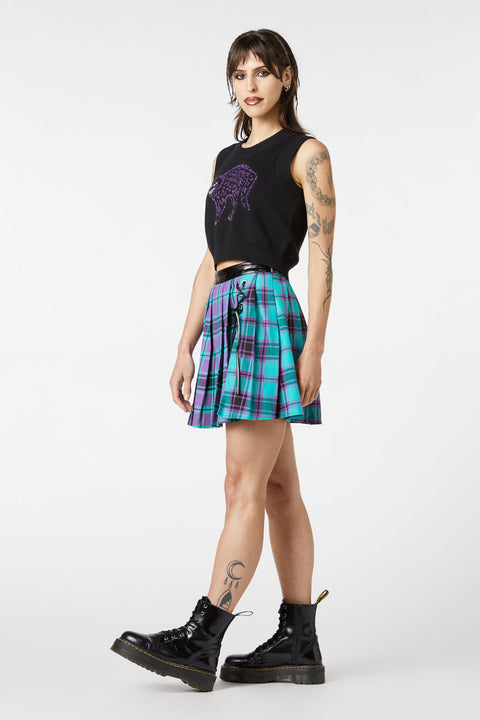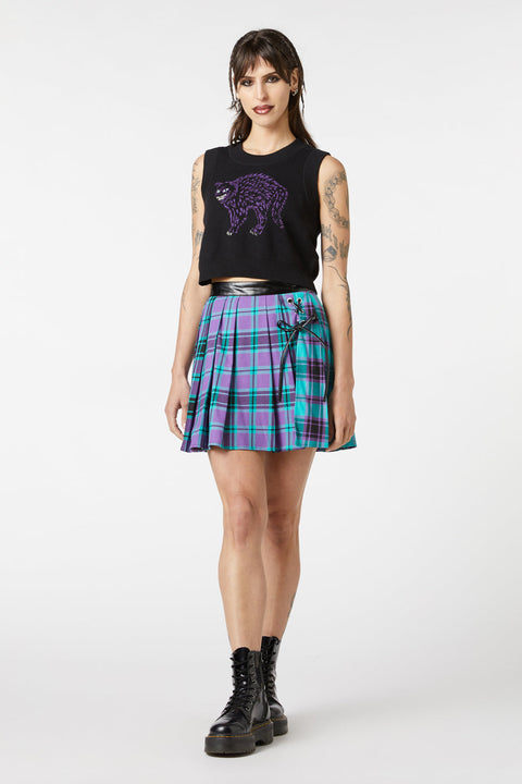 Træd ind i skyggerne med en drilsk kant i Grinning Cat Placement Sweater fra Dangerfield. Denne gotisk-inspirerede ærmeløse strik er lavet af blød 100% bomuld, der tilbyder både komfort og attitude. Den runde halsudskæring og den korte længde skaber en flatterende silhuet, mens det dristige grinende kattedesign på forsiden tilføjer et strejf af uhyggelig charme.