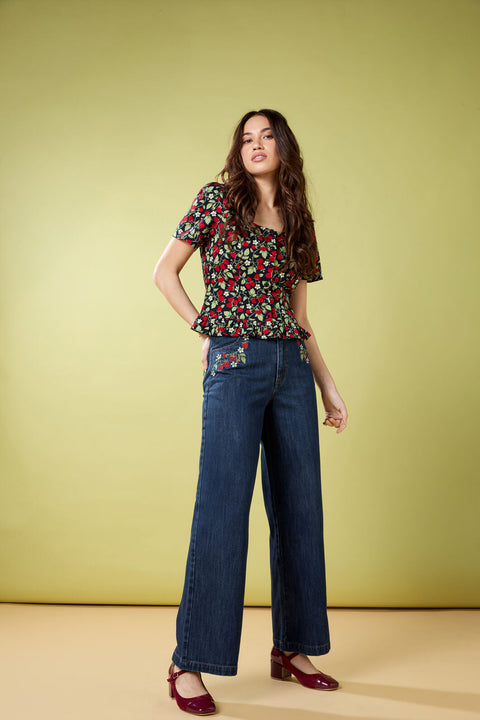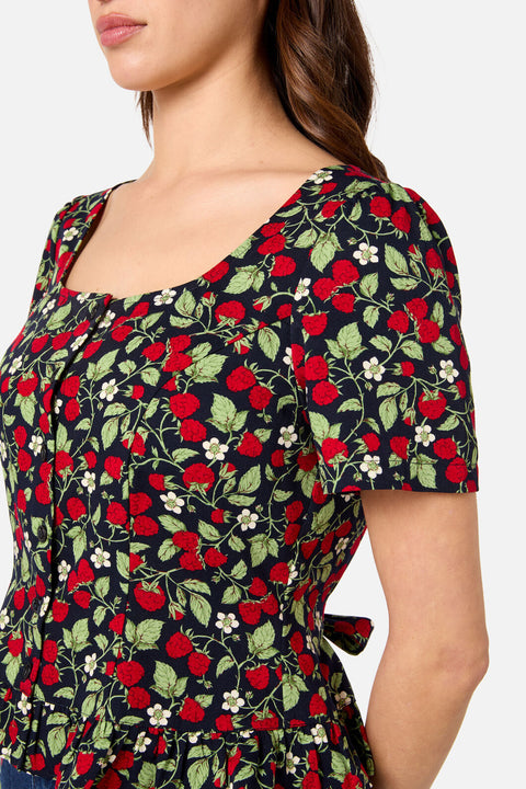 Tilføj et strejf af legende charme til din garderobe med Raspberry Short Sleeve Top fra Princess Highway. Med et livligt print af saftige hindbær og fine blomster på en rig marineblå base er denne søde top i bomulds-viskoseblanding fuld af vintage-inspireret flair. Med sin bløde firkantede halsudskæring, pufærmer og flæsekant er den et must-have til både solrige dage og afslappede udflugter.
