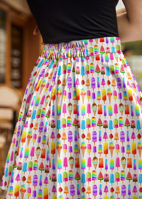 Den ultimative sjove og flirtende nederdel! Vist i vores “Ice Cream”-print, har denne nederdel i vintage-stil en elastisk talje bagpå for nem brug og en lynlåslukning bagpå.