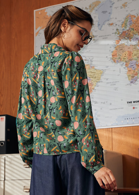 Croissanter, vin, stribede katte og Eiffeltårnet danser hen over en grøn baggrund, mens den afslappede camp-krave-silhuet holder tingene ubesværet cool. Med lange ærmer, knaplukning foran og det helt rigtige touch af retro-charme er denne skjorte dit pas til legende hverdagseventyr – intet boardingkort kræves.