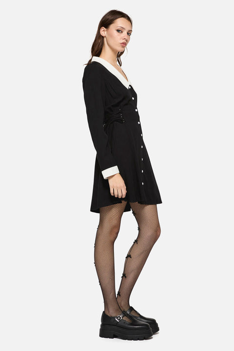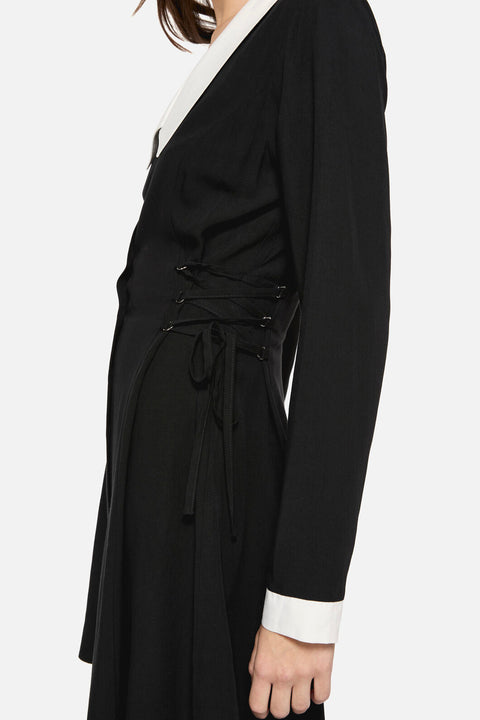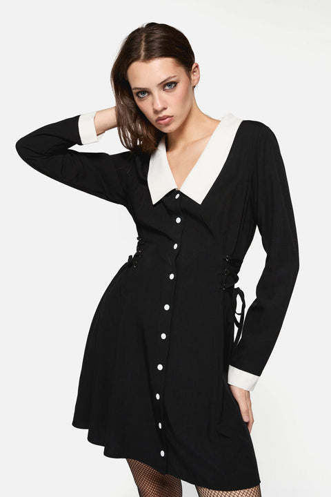 Udstråle romantisk gotisk energi med denne ubesværet dramatiske midikjole. Designet med elegante kontrastdetaljer og korsetinspirerede bånd i taljen for en tilpasselig pasform.