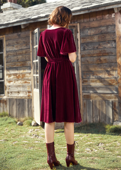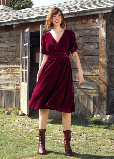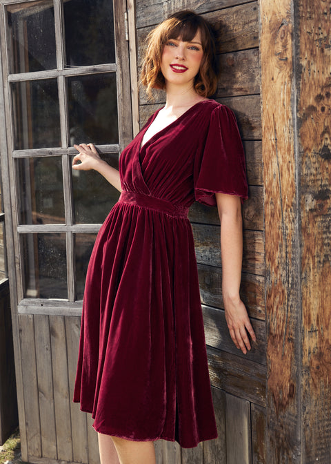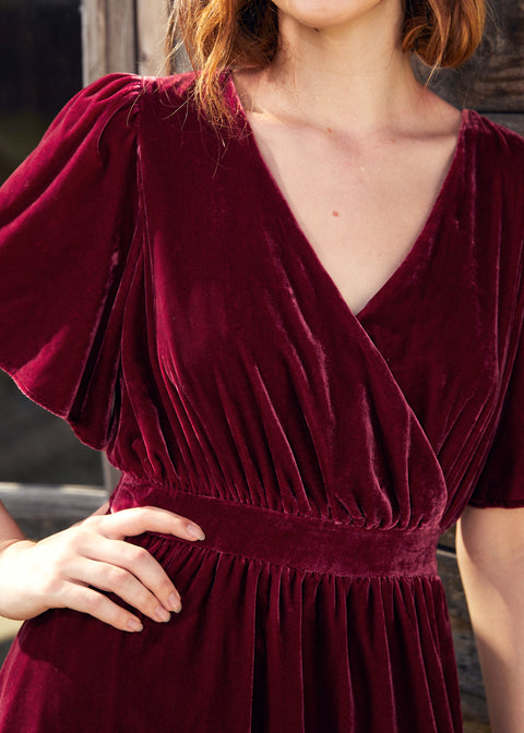 I en rig, rødbederød nuance får denne flagrende og flydende midikjole i fløjl det at krydse rummet til at ligne en smuk dans. Denne ubesværet elegante midikjole er lavet af et strækbart fløjlsstof med en smuk glans og en plysagtig tekstur og har korte flagrende ærmer, en surplice-udskæring og en samlet høj talje, der giver plads til en draperet og drømmende A-formet nederdel.