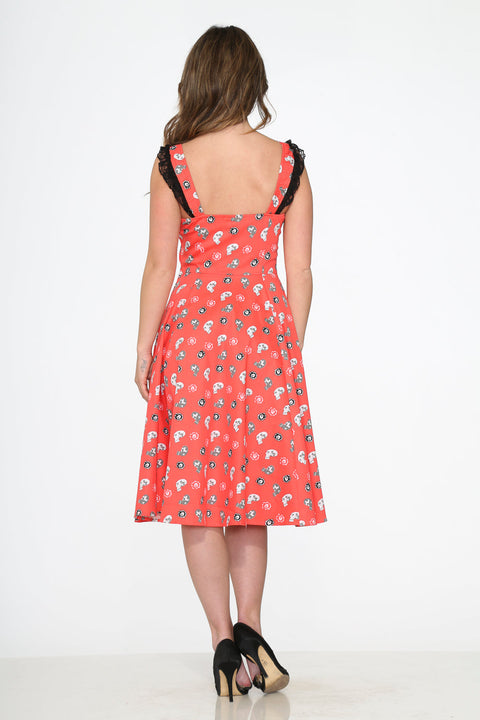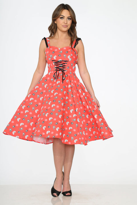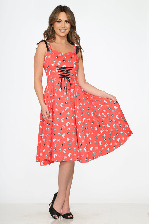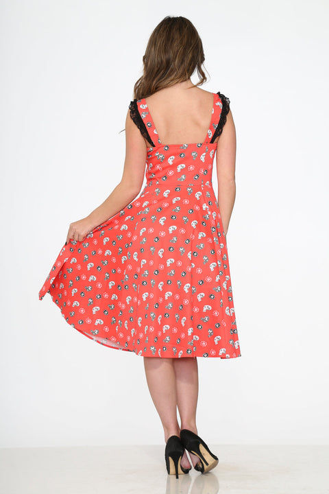 Lidt sød, lidt uhyggelig – denne vintage-inspirerede swingkjole fra Orchid Bloom handler om dristig charme. Med en karminrød baggrund krydret med legende kranier har dette iøjnefaldende stykke korsetlignende snørebånd ved overdelen og yndige flæsekantstropper for et strejf af drama.