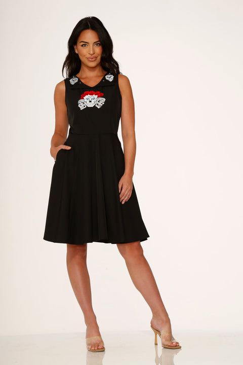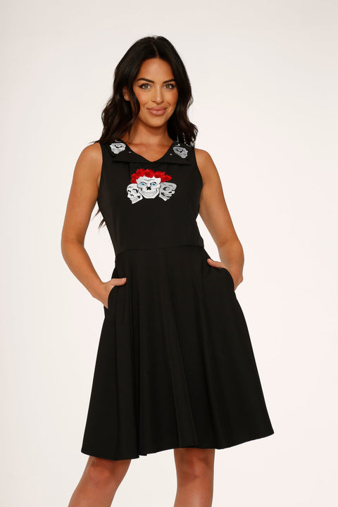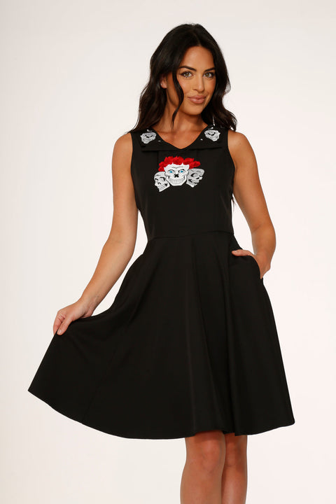 Gotisk romantik møder retro charme i denne iøjnefaldende swingkjole fra Orchid Bloom. En slående krave broderet med klassiske kranier og dristige røde roser tilføjer et dramatisk twist til en tidløs silhuet. Lavet i et behageligt strækstof med et flatterende fit-and-flare-snit og en fuld nederdel skabt til at sno sig rundt i.