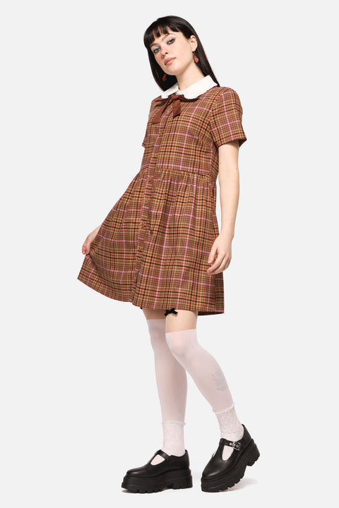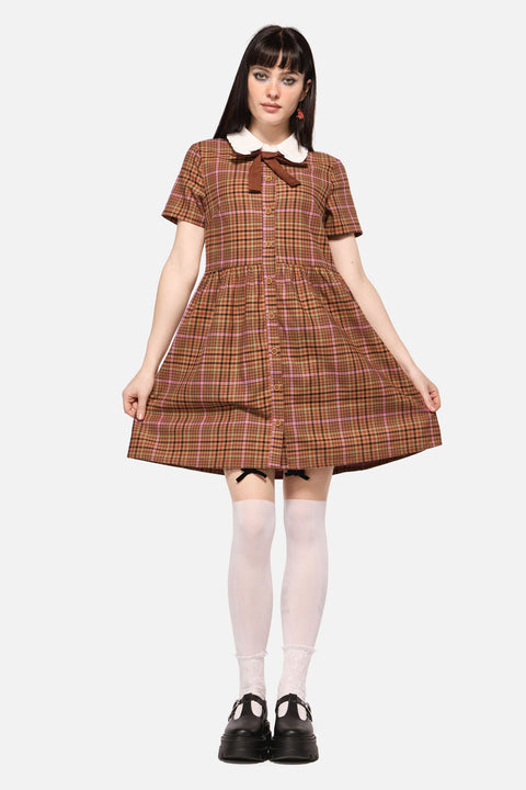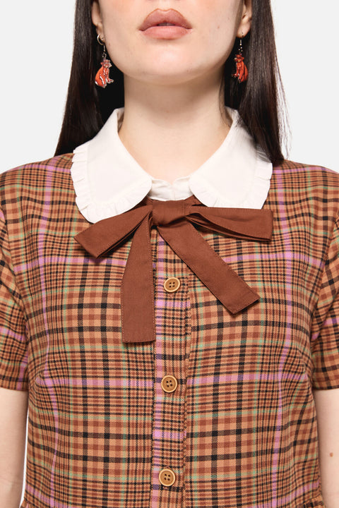 Denne drømmende tartankjole blev skabt til skovvandrere, mørke akademikere og vintage-sjæle. Med sin flæsekrave, sløjfe og fyldige nederdel er det den slags stykke tøj, der hvisker historier om fe-ringe og støvede gamle biblioteker. Jordnær, romantisk og en smule fortryllet.