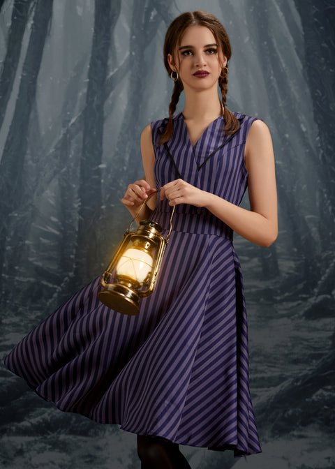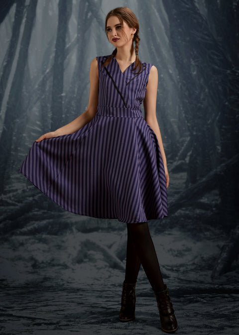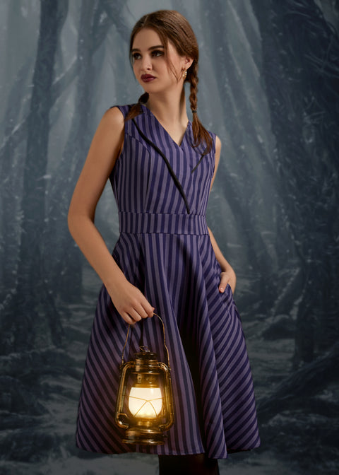Sæt et statement i striber med den sorte og lilla stribede swingkjole fra Orchid Bloom. Med en slående kombination af sorte og lilla lodrette striber tilføjer denne vintage-inspirerede swing-silhuet et strejf af personlighed til din garderobe.