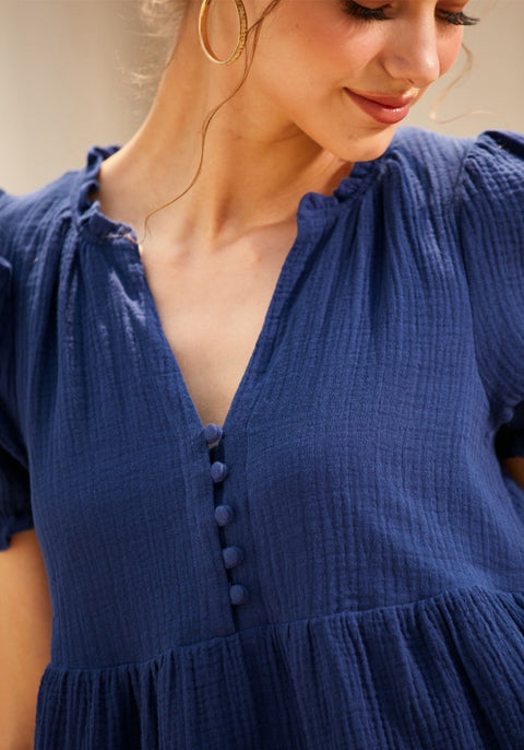 Dyk ned i et strejf af marineblå med denne yndige babydoll-kjole, frisk fra vores navnebror-mærke ModCloth. Denne kjole har fine knapdetaljer på brystet, der tilføjer et strejf af sjov til dens mini-silhuet. Dens flagrende stof og pufærmer flagrer med hvert skridt, hvilket gør den til en drøm at have på til en luftig dag ude eller en afslappet sammenkomst. Den behagelige pasform sikrer, at du føler dig lige så godt tilpas, som du ser ud. Uanset om du slentrer gennem et weekendmarked eller nyder en dag i parken, er denne kjole din go-to til et ubesværet stilfuldt ensemble.