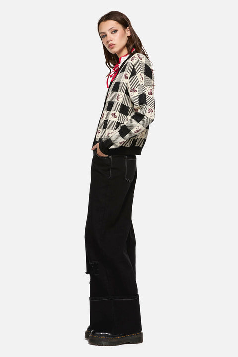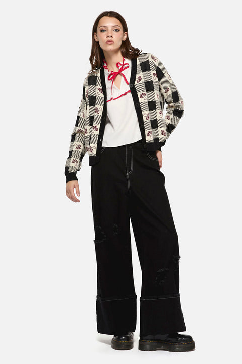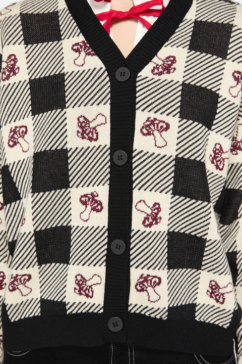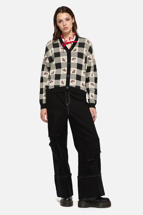 Den hyggeligste gingham-getaway, du nogensinde vil have på. Denne bløde bomuldsstrikcardigan har et drømmende sort-hvidt cottageprint inspireret af vintage-landlig charme. Med sin afslappede pasform, sænkede skuldre og grafiske illustrationer er den perfekt til at have på over præriekjoler eller til at kombinere med din yndlings højtaljede denim.