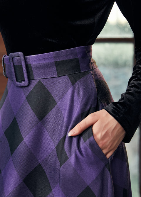 Fra vores navnebror ModCloth kommer Twilight Serenade Midi Dress, en nostalgisk ode til vintage charme med et moderne twist. Klædt i et rigt lilla tern, tilbyder dette strikkede stykke en flatterende top med dobbelt rund halsudskæring og en kontrasterende nederdel, fremhævet med en bælte i taljen for en defineret silhuet. Medium stretch sikrer komfort og fleksibilitet, mens en diskret lomme tilføjer et funktionelt touch. Ideel til festlige sammenkomster eller hyggelige vinterdates, garanterer denne kjole en fantastisk entré.