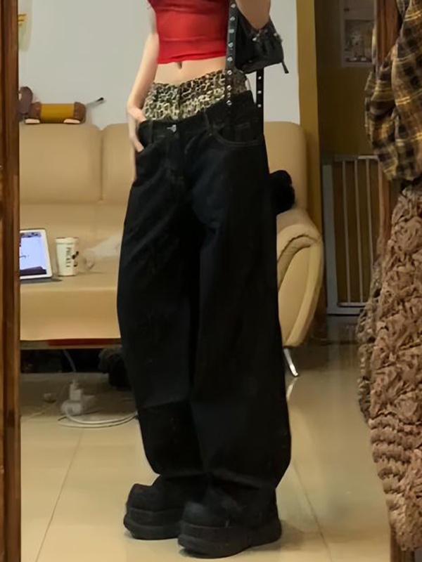 American Retro Leopard Print Stitching Boyfriend Jeans