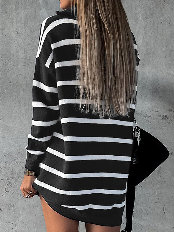 Striped V Neck Half Zip Loose Knit Sweater Dress