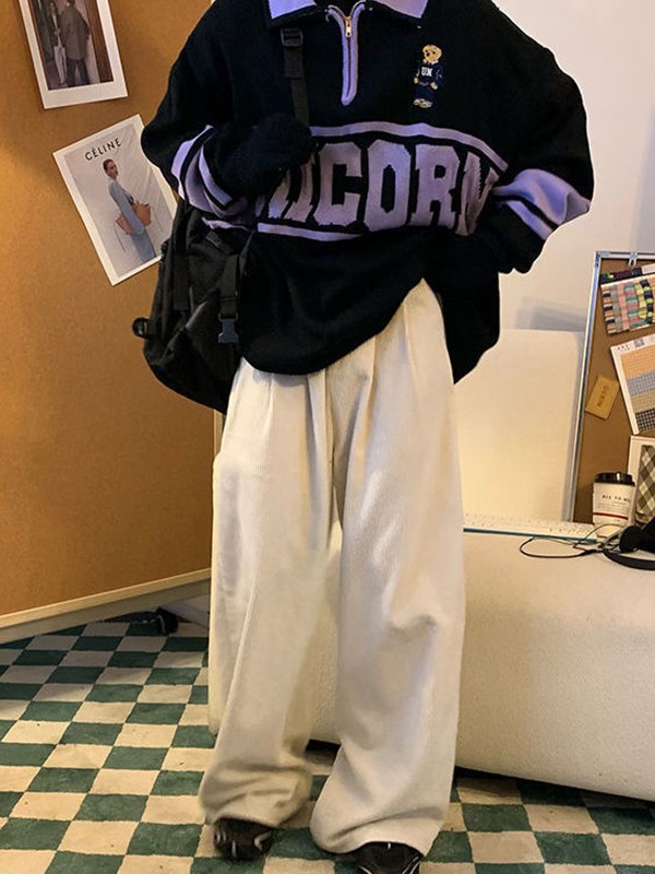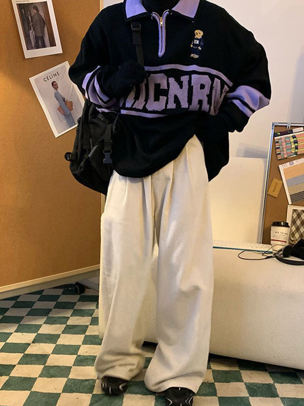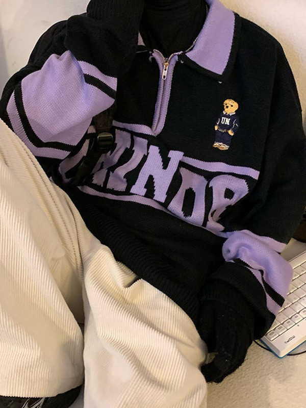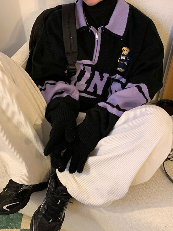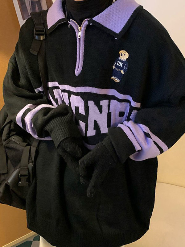 Description: Looking for some retro-inspired jumpers for city boy outfits. This relaxed polo sweater features a contrast panelStyle, it has letter jacquard, a cartoon bear at front chest, and classic ribbed detail. Ended with half zip fasten design.